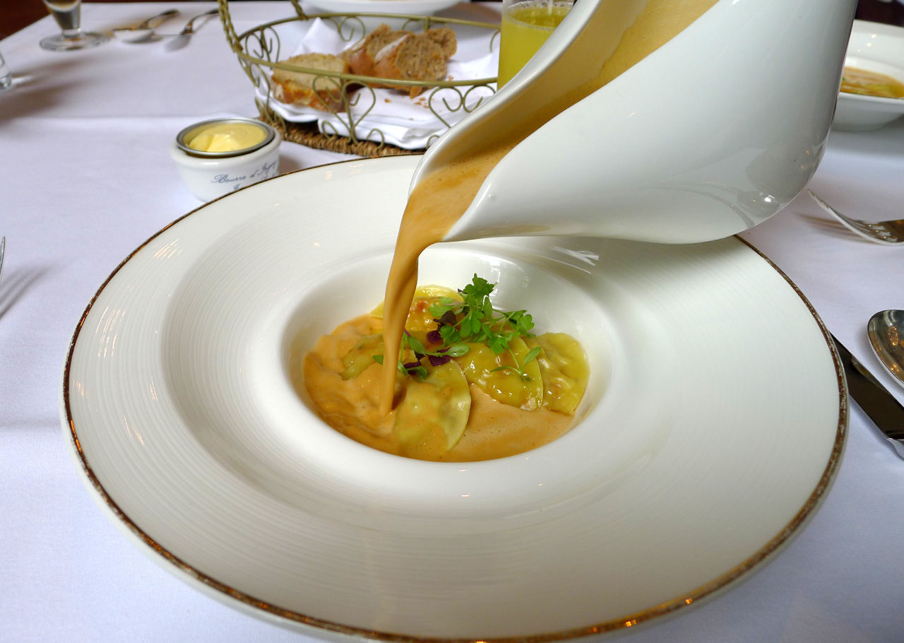 続いて、ロブスターのスープです。ロブスターの入った小さなワンタンに、ロブスターの味噌で作ったスープをかけて食します。濃厚で菊さんの好きな味でした。