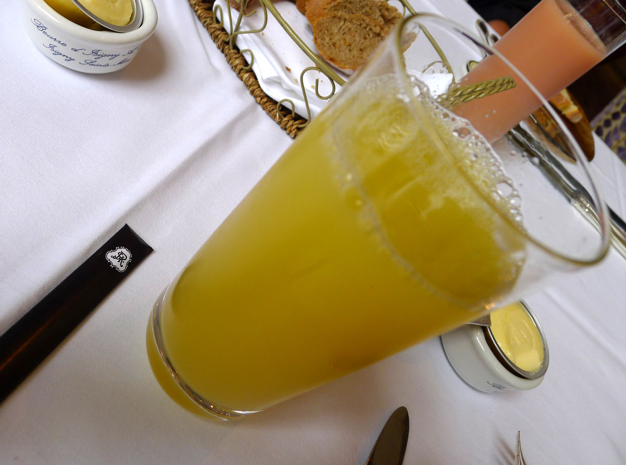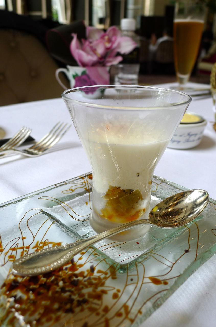 グラスに入った前菜です。2層になっていて、下の層にはトリュフが少し入っています。上の層と混ぜると香りの良いスープのような味になりました。