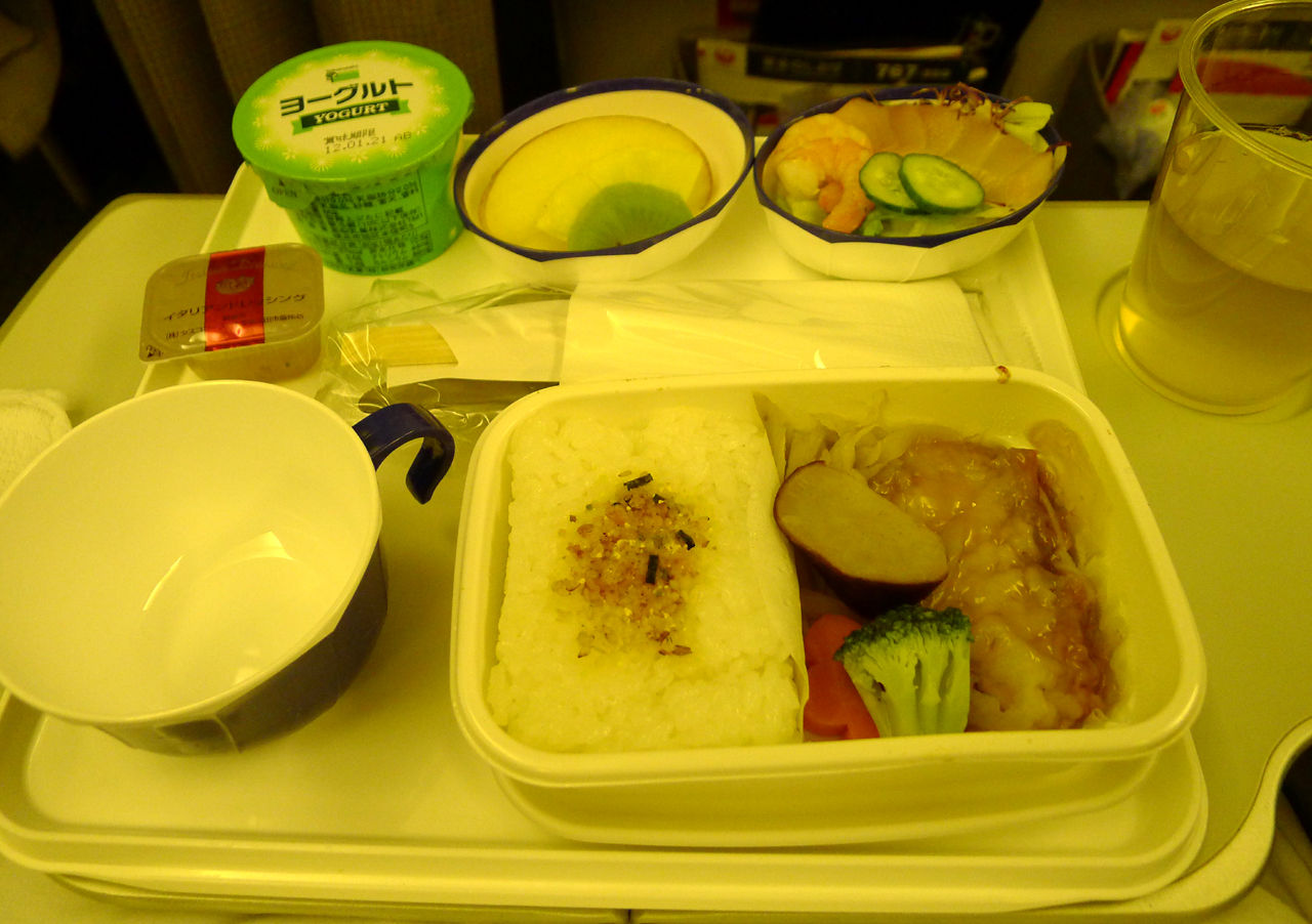 離陸してすぐに”おにぎり”が出されますが、到着3時間前には朝食が出てきます。メインは「浜鯛揚げ煮」でした。